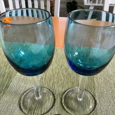 3 viinilasia, kaksi musta jalka, yksi sininen jalka, yht 6e, Porvoonkatu