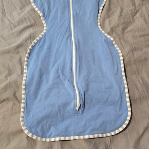 Sininen lasten unipussi, valmistettu puuvillasta, koko L. Soveltuu käytettäväksi lasten unipussina tarjoamaan pehmeyttä ja lämpöä nukkuessa. Swaddle up