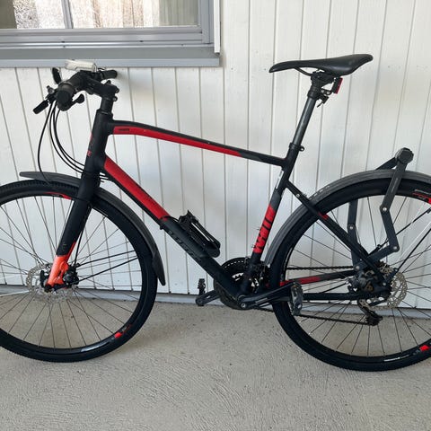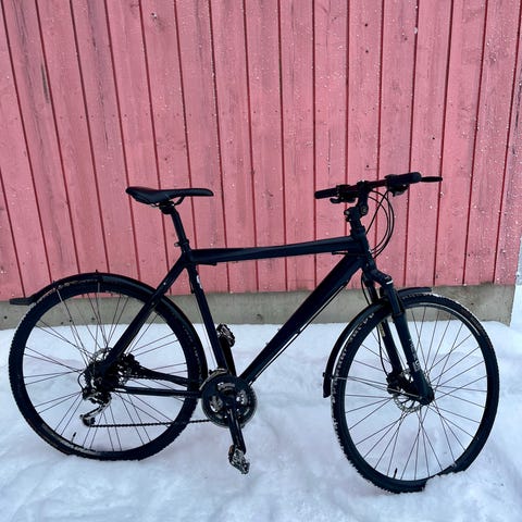 Cannondale Quick CX hybridipyörä, runkokoko (arviolta) L, n. 180-185 cm kuskille. Rengaskoko 28"/700c. Fabric Scoop satula. Varustettu käsijarruilla (V-jarrut) ja tavaratelineellä. Shimano Nexus keskiövaihteet, 8-vaihteinen. Alla nastarenkaat ja mukaan tulee myös kesärenkaat. Vaihdevaijerin sisälle kondesoitunut vettä, minkä takia vaihteiden käyttö nihkeää pakkasilla. Ongelma väistyy pakkasten myötä tai vaihdevaijerin kuorineen vaihtamalla.