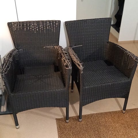 3 tuolia ja 2 pehmustetta, jaloissa vähän ruostetta, muutoin hyvässä kunnossa.