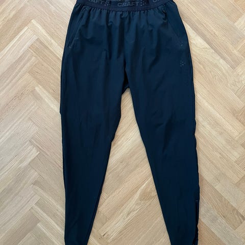 Craft urheiluhousut kokoa M. Musta väri. Housuissa on vetoketjulliset lahkeet ja vyötäröllä kiristysnauha. Materiaali on lämmin ja sopii monipuoliseen urheilukäyttöön talvisin ja välikausina. Takataskuun mahtuu puhelin. Polvien leikkauksen takia sopivat erityisen hyvin pyöräilyyn.