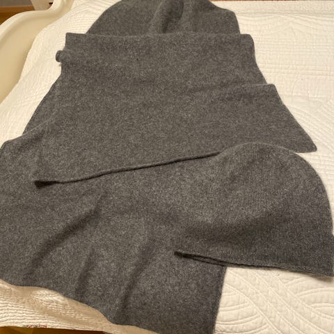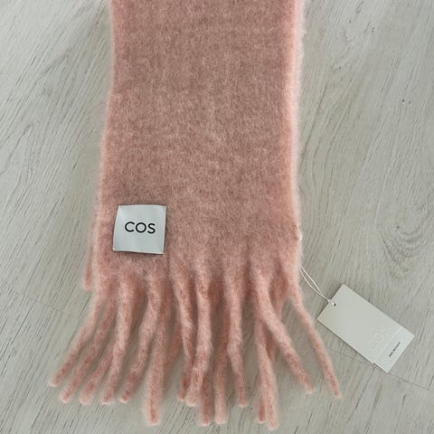 COSin uudenveroinen muhkea kaulahuivi, pituus n. 200 cm ja leveys n. 50 cm. Väri musta, jossa seassa valkoista. Materiaalilappu poistettu, mutta muistaakseni puuvillan ja villan sekoitusta, lisänä korkeintaan vähän polyamidia, ei muita tekokuituja.