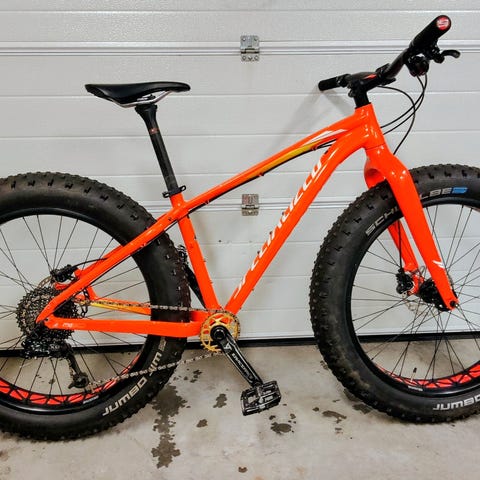Tästä suoraan ajoon varsin vähän ajettu läskipyörä kaksilla kiekoilla, joissa sekä talvi- että kesärenkailla.