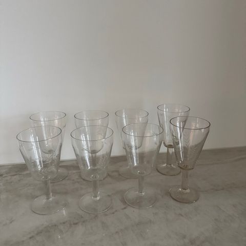 Myydään 8 kpl vanhoja viinilaseja. Karhulan lasitehdas, Göran Hongell. Viljantähkäkuvio, moitteeton kunto. Vetoisuus 23 cl.