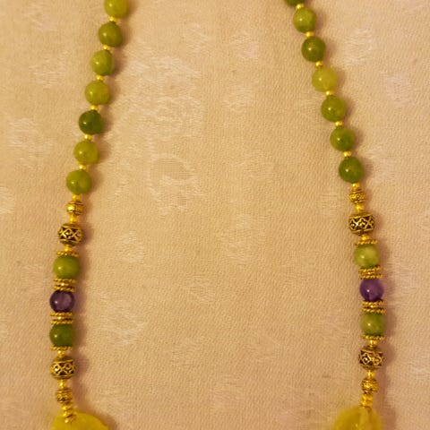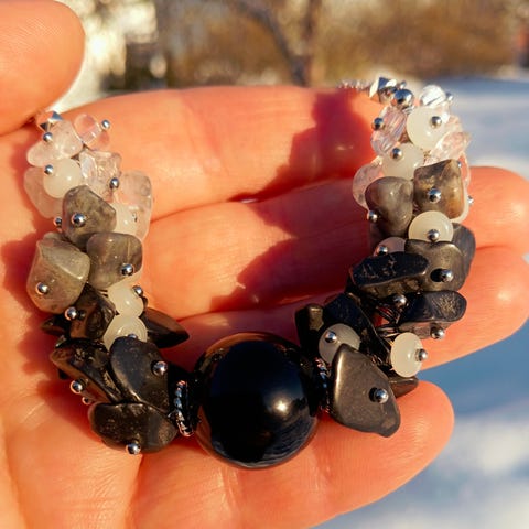 Kaulakoru valkoisista kivistä ja hopeanvärinen riipus – boho-tyyli