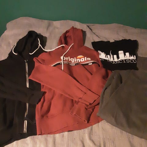 Miesten hyväkuntoinen vaatepaketti sisältäen neuleita, urheilupaitoja, espritin puuvillapaita. Lisätietoja erikseen kysyttäessä.