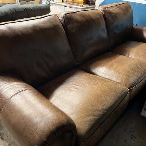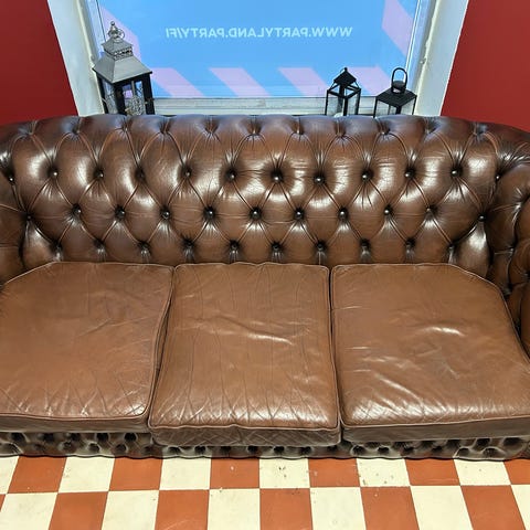 Myyntiin pari vuotta vanha nahkasohva, moitteena yhdestä napista lähtenyt verhoilu. Mahdollisesti myös kuljetus lähiseudulle järjestettävissä.