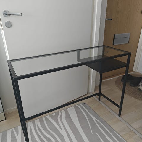 Ikea Vittsjö musta metallinen työpöytä lasikannella. Käytetty kunto. Yhdestä jalasta puuttuu korkeussäädin.
