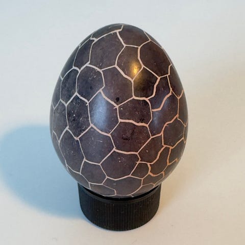 Koristemuna on ison kakanmunan kokoinen. Se on valmistettu kivestä, ja siinä on kaiverruksia tai kuvioita.