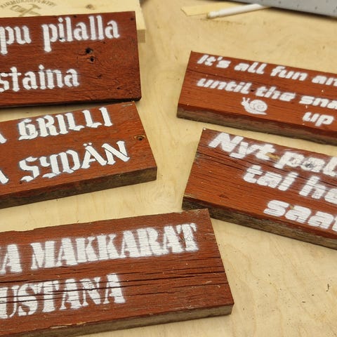 Metalliset kyltit, joissa tekstit 'Dinner Choices: 1. Take It 2. Leave It' ja 'Complaints to the cook can be hazardous to your health'. Kylteissä näkyy käytön jälkiä ja pientä maalivaurioita. Yhteishinta 6€