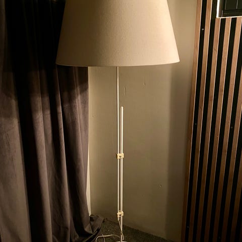 Valkoinen "glitterpintainen" korkea jalkalamppu. Sisällä kaksi lamppua, lattiakatkaisin. Siisti kunto.