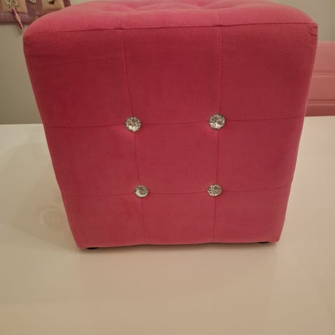 Pyöreä rahi harmahtavan vaaleanpunaisella /liilalla samettipäällysteellä. Rahi soveltuu istuimeksi tai jalkatueksi. Parissa kohtaa kissa raapinut (krs kuva). Ei haittaa käyttöä eikä oikein näy käytössä. Voi myös päällystää uudelleen