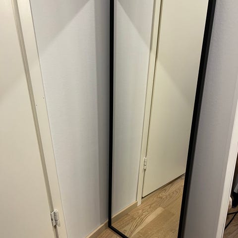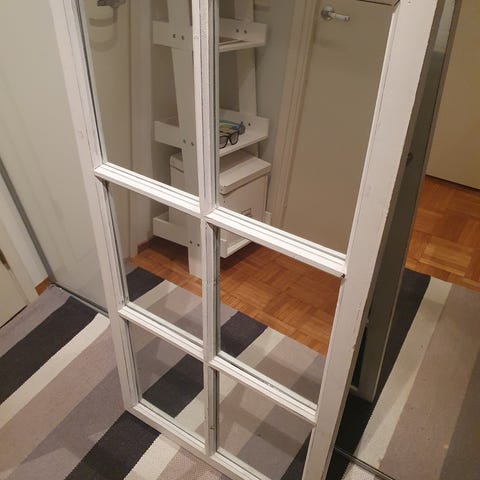 Valkoisella kehyksellä oleva peili. Voidaan laittaa vaakaan tai pystyyn. Korkeus 121cm ja leveys 31cm