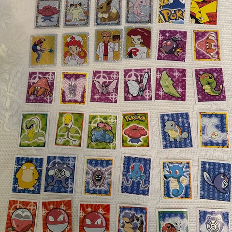 Pokemon Merlin tarrakirja 1999. Kirjassa on valmiina noin 50 tarraa liimattuna sivuilla. Ensimmäisellä sivulla on merkitty kynällä hankittuja tarroja.