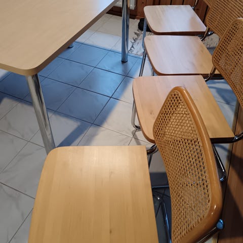 Tuoli 1: Ehjät rottingit, mutta istuinosassa rottinki hieman irti oikealta sivulta.