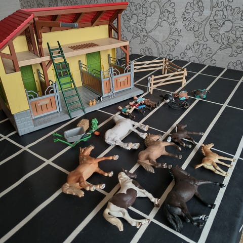 Kattava sleich setti seuraavalle leikkijälle 200€/tarjous. Yhdestä karsinan ovesta sarana poikki, muuten hyvässä kunnossa koko setti. Löytyy talli, hevosen kuljetusvaunu, aitaus, pesupaikka, hevosia, ratsastajia, este, hevosen hoitovälineitä, satuloita, loimia, suitsia ja pikku tarvikkeita yms.