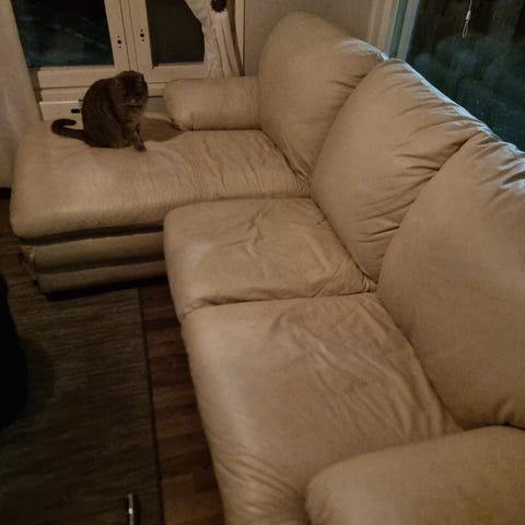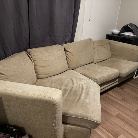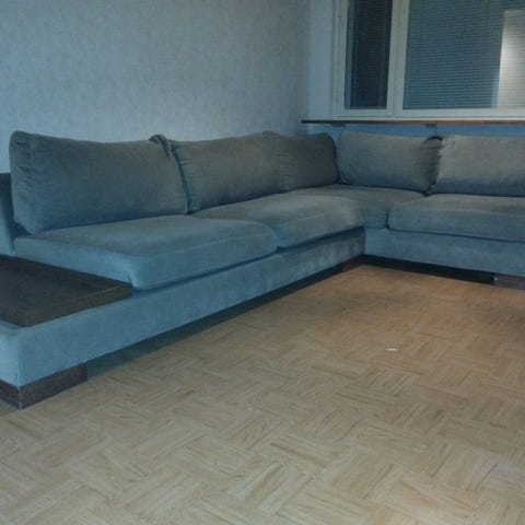 Annetaan pois kulmasohva muuton alta. Sohva on vanha ja kulunut, mutta kangas ehjä ja runko jämäkkä.