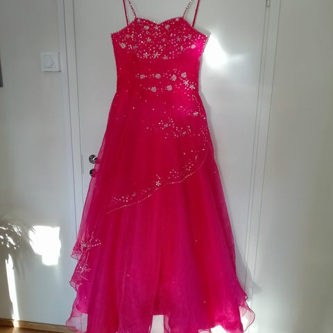 Kaunis vaaleansininen S/M-kokoinen mekko vanhojen tansseihin. Ollut 168cm. pitkän tanssijan päällä, juuri ja juuri varpaankärjet näkyviin jättävä. Mekkoa kavennettu ompelijan toimesta hiukan takaa, kangas jätetty paikoilleen eli helppo optio antaa lisää tilaa pienellä vaivalla takaisin. Mekossa erillinen vannealushame mukana, tekee helmasta täydellisen muhkean ja kauniin.