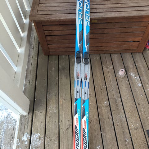 Peltonen sukset 150 cm ja sauvat 100 cm. Soveltuvat perinteiseen hiihtotyyliin. Ostettu n. 130 cm pituiselle lapselle.