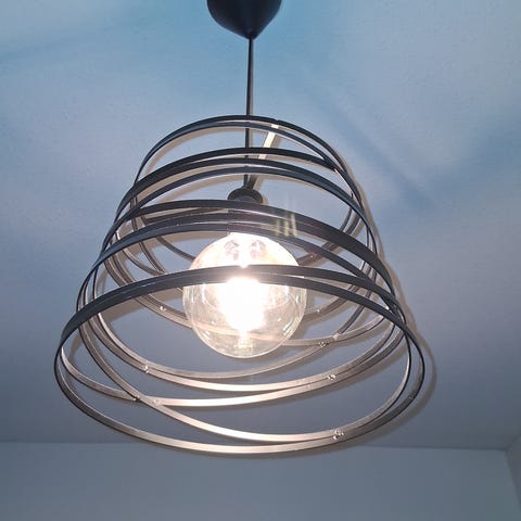 Upea takorautainen kattovalaisin,kolme valaisinta. Valaisimissa valkoiset varjostimet, jotka suuntaavat valon alaspäin. Sopii sisäkäyttöön ja tarjoaa valaistusta esimerkiksi ruokailutilaan tai oleskelutilaan.Leveys 107cm,korkeus 106cm