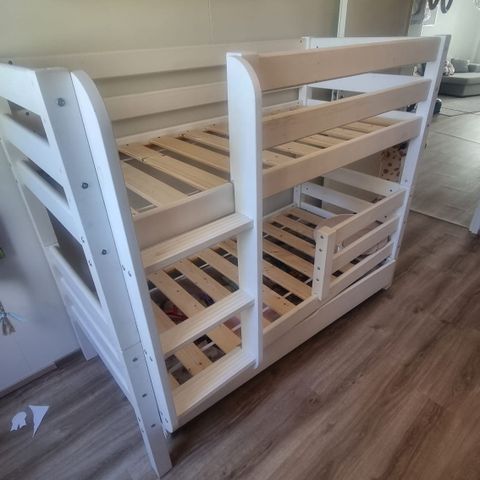 Tukeva puinen kerrossänky säilytyslaatikolla suoraan käytöstä seuraavalle. Patjat saa mukaan haluttaessa.