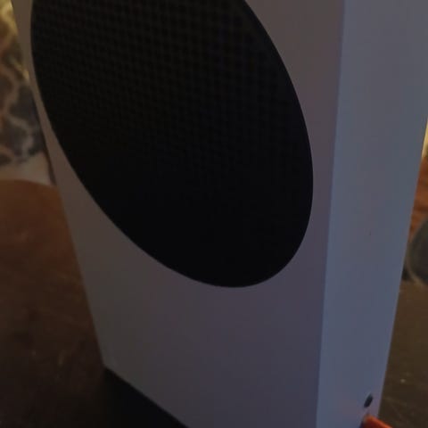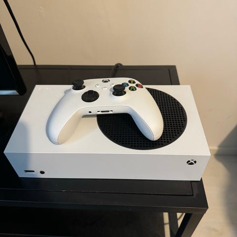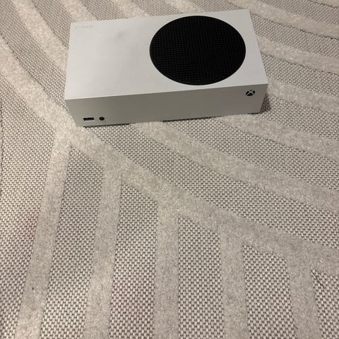 Microsoft Xbox Series S pelikonsoli valkoisella värillä. Konsolissa on useita liitäntöjä, mukaan lukien Ethernet-portti, USB-portit ja HDMI. Mukana tulee langaton ohjain ja kuuloke mikrofonilla. Sopii Xbox Series -pelien pelaamiseen.