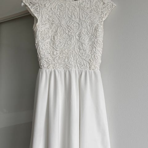 Kaunis valkoinen juhlamekko koossa 36. Yläosa pitsiä ja alaosa laskostettua sifonkia. Laskeutuu kauniisti. Todella hyväkuntoinen, kuin uusi.