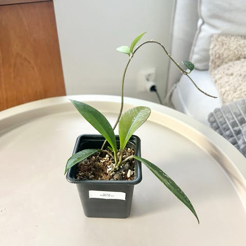Hyvin juurtunut posliinikukan pistokas 5*5 cm purkissa. En enää varmaksi tiedä tämän lajia/lajiketta, mutta epäilen olevan Hoya gracilis memoria. Tämä on nopeakasvuinen ja helppohoitoinen, lisäkuvassa näkyvä emokasvi on n. vuosi sitten pienenä pistokkaana hankittu.
