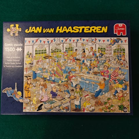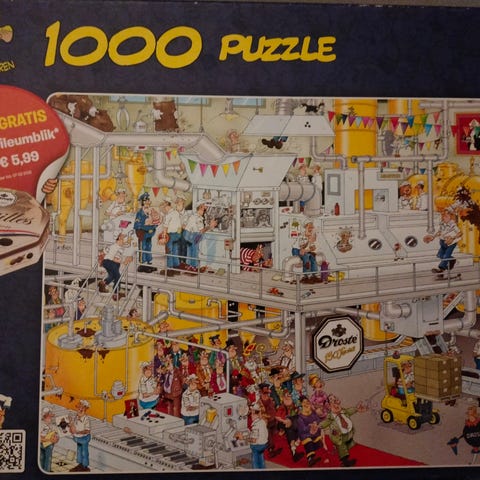 Kierrosta Jan Van Haasteren Toy Shop 1000 palan palapeli. Yleisilme ok, laatikko teipattu kiinni ja kirpputorin hintalappu kyljessä. Kissatalous.