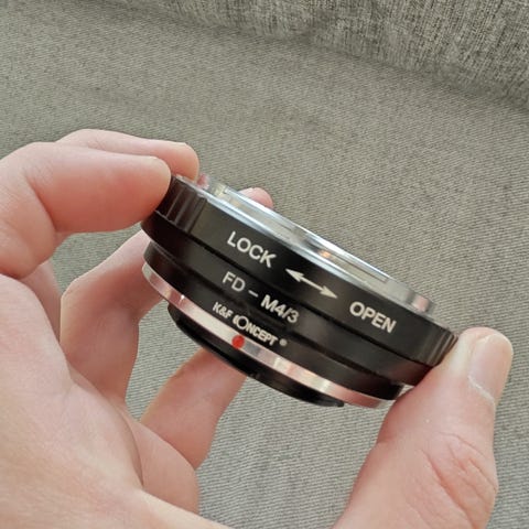 Adapteri Canon FD linssien käyttämiseen M4/3 kamerassa. Mukaan M4/3 tulppa.