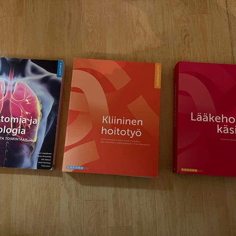 Pino kirjoja sairaanhoitajan opintoihin. Vuodelta 2006. Kirjat erittäin hyvässä kunnossa ja siistit. Ei merkintöjä sivuilla. Mahdollisuus ostaa kaikki settinä tai yksittäisiä. 2€ per kirja. Kaikki yhteensä 12€.