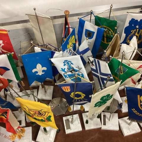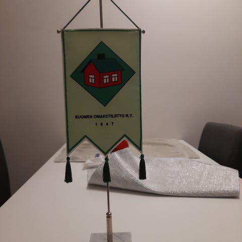 6 kpl pöytästandaareja/-viirejä. Päällystöyhdistyksen pöytäviiri, SOK pöytäviiri, OKO Osuuskassat pöytäviiri, Sotainvalidien pöytästandaari, Versowood pöytäviiri, OP pöytäviiri.