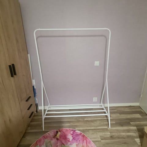 Hyvässä kunnossa oleva kompaktin kokoinen vaaterekki. Ei selkeitä käytön jälkiä, ostettu tokmannilta merkki ei muistissa. Tarjota saa rohkeasti, nopea haku muuton tieltä pois😊