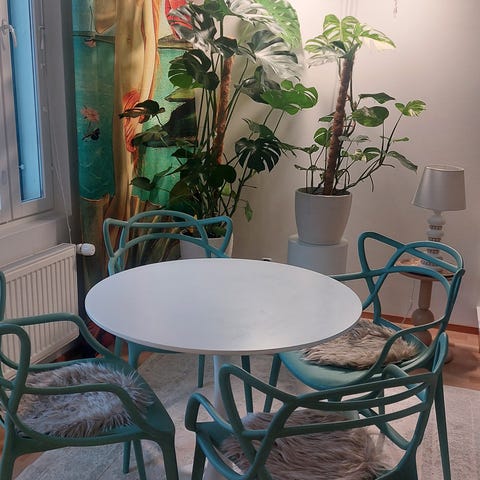 Tukeva ja siisti ruokapöytä. Pöydän pintakuvassa etualalla varjo kuvanottajasta.