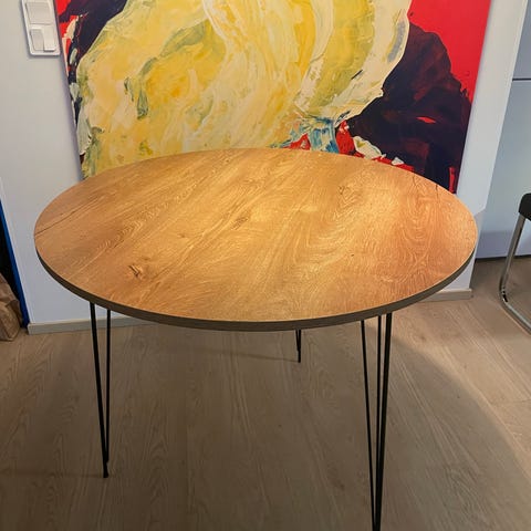 Kuvanmukainen ruokapöytä, siisti eikä puutteita/virheitä. Jalka materiaaliltaan metallia, jossa puujäljitelmä pinta. Tukeva.