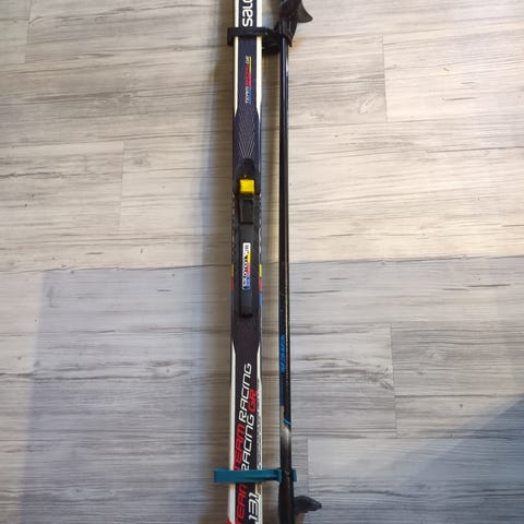 Kouluhiihtoihin hyväkuntoiset Salomon 131 cm sukset sns ja exel sauvat 105 cm.