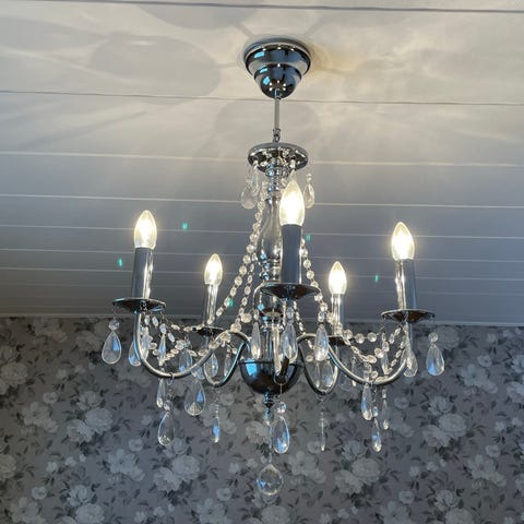Kattovalaisin, kristallit ovat lasia,ei muovihömppää. Toimiva ja näyttävä paikallaan asennettuna. En mielellään lähettele valaisinta.