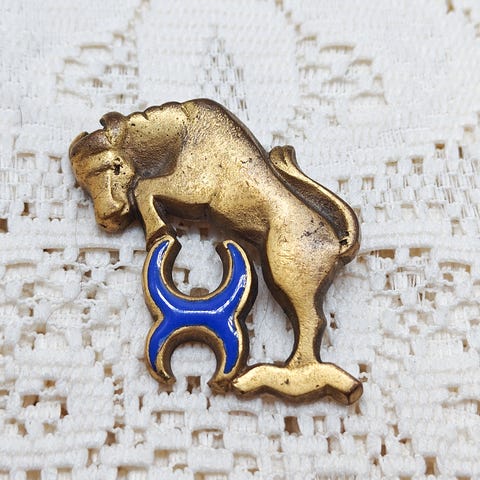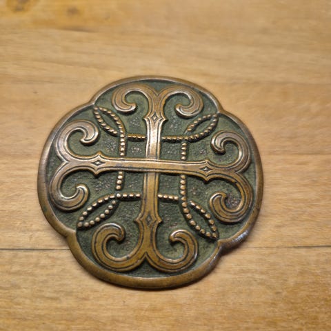 Myydään ajan patinoima, luultavasti pronssinen todella vanha, mutta hyväkuntoinen rintakoru.