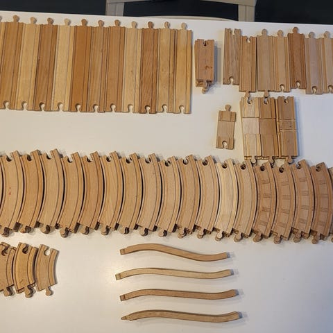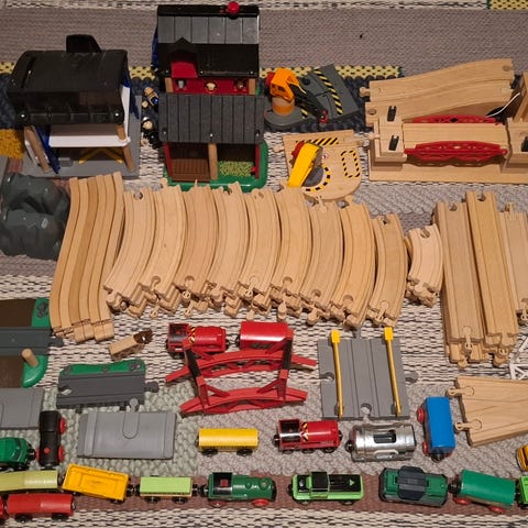 Brion junaradan osia kivassa NOBODINOZ -kassissa (koko n. 40cm x 40cm x 40cm). Lisäksi läjä Ikean lisäosia.