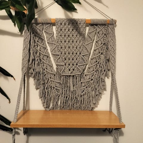 Kaunis ja luonnollinen makramee-tyylinen seinähylly, jossa on täyspuinen taso. Sopii hyvin esimerkiksi pienten kasvien, kynttilöiden tai koristeiden esillepanoon 🌿