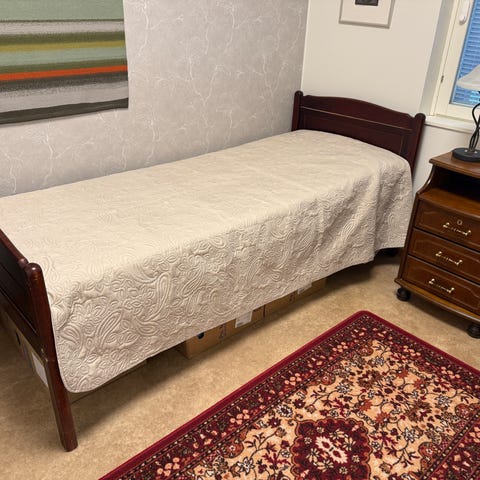 Koivu puinen Kaiserin sänky jossa musta runkopatja. Sänky soveltuu makuuhuoneen kalusteeksi. Runkopatjan koko ja materiaali eivät ole tiedossa.