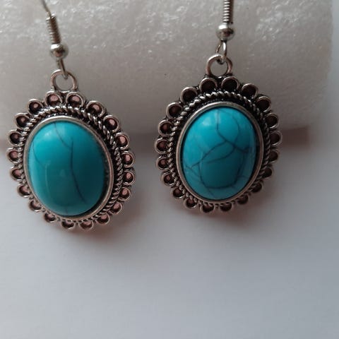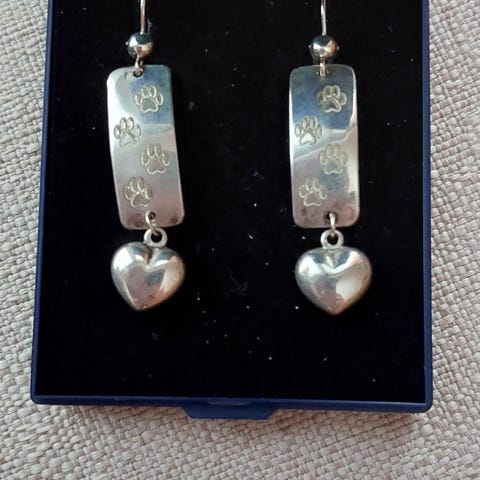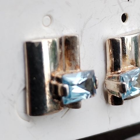 Safiirikorvikset,hopeaa. Eivät käyneet itselle joten aitoustodistus hukkunut. Stoppareissa hopean merkki.