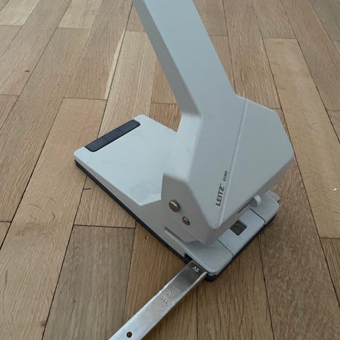 250 arkkia hopeanharmaa. Suurteholävistin. Lävistyskyky 250 arkkia. Metallia, metallinen paperiohjain kokoon A3 saakka. Suuri vipuvälitys, jonka ansiosta fyysisen voiman tarve vähäinen. Reikien läpimitta 6 mm. MUKAAN n. 1 800 kpl 23/15XL niittejä arvo n. 30 €.