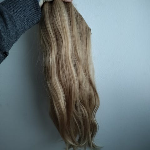Vaalea leveä klipsipidennys, jossa paljon paksua hiusta. Suorana 50cm pituiset. Ei aitoa hiusta! 5 kpl klipsejä. Oikea sävy näkyy kuvassa valkoista taustaa vasten.
