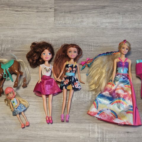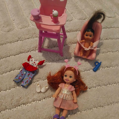 Mattel Barbie uudempi & vanhempi Kelly. Toisessa nukessa vuosiluku 1994, toisessa 2016/2017. Mukana erilaisten Barbie lapsinukkejen vaatteita & tarvikkeita, muutama tarvike muiden valmistajien. Kalusteet muiden valmistajien, pöytä & tuolit Ikea -nukketaloon kuuluvia.
