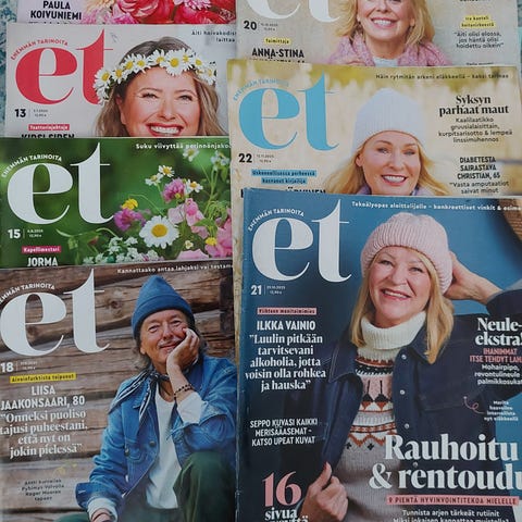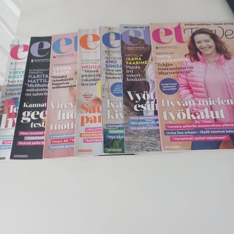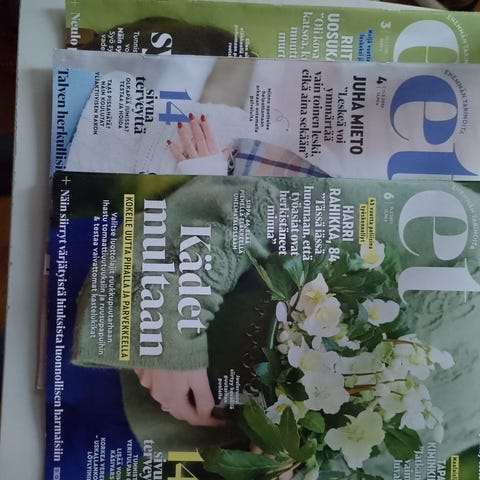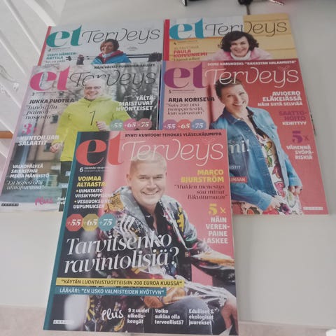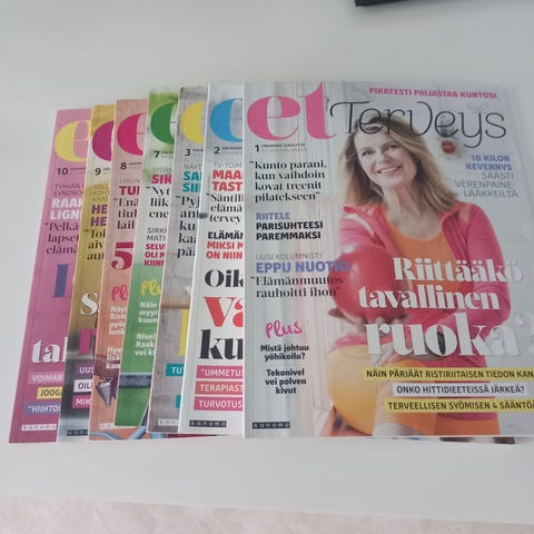 Myydään Itä-Helsingissä ET-Terveys lehdet nrot 1-10 / 2025, Hyvä Terveys (nro 11, postissa rypistynyt reunasta)-, Kotiliesi terveys (lokakuu)-lehdet vuodelta 2025, yht. 12 kpl, kaikki yht. 7 euroa.