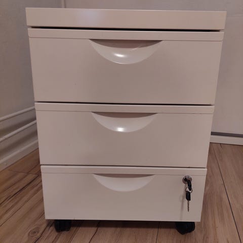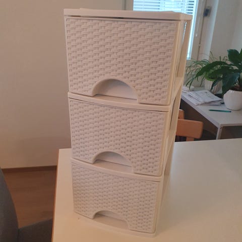 Ikea laatikosto rullilla, valkoiaet laatikot ja runko puuviilua, valmiiksi koottuna. Laatikostot toimii vyvin.