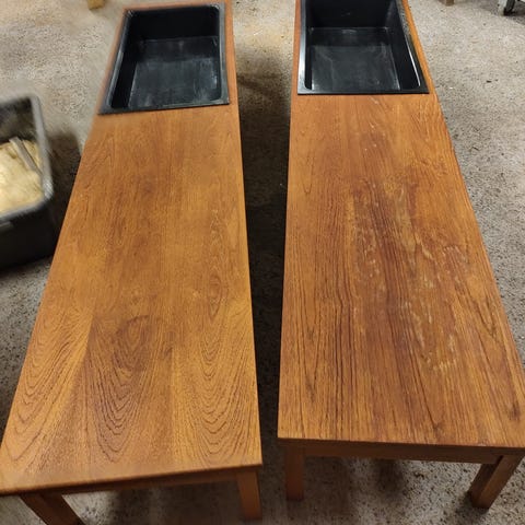 Taso on viilutettua tiikkiä, jalat kokonaan tiikkiä.