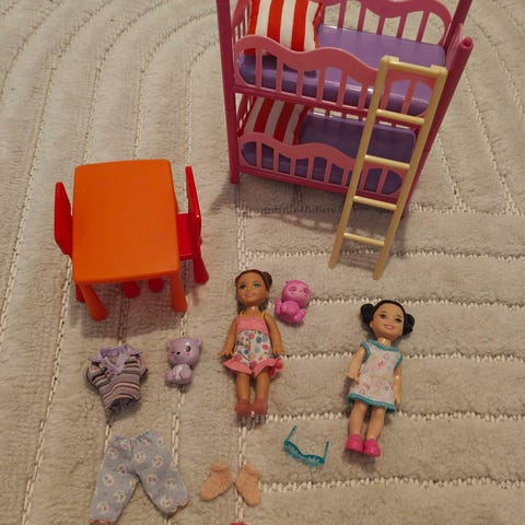 Mattel Barbie Kelly nukke & vauva nukke. Kellyssä vuosiluku 1994, vauvassa 1973. Mukana erilaisten Barbie lapsinukkejen vaatteita & tarvikkeita, muutama tarvike muiden valmistajien. Syöttötuoli Simba-merkkinen, istuimessa ei merkkiä. Setissä ainakin Eatin' Fun Shelly nuken haalari vuodelta 1997.