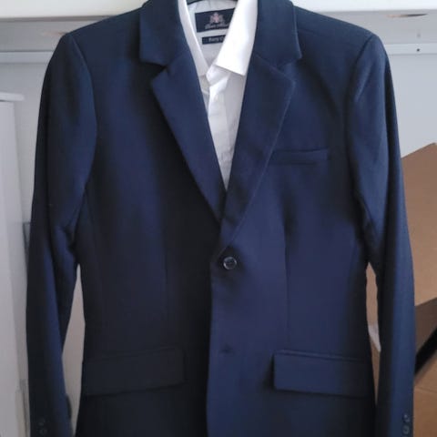 Kerran käytetty tumman sininen puvun takki (Name It) ja valkoinen kauluspaita. Hajusteeton ja eläimetön talous.